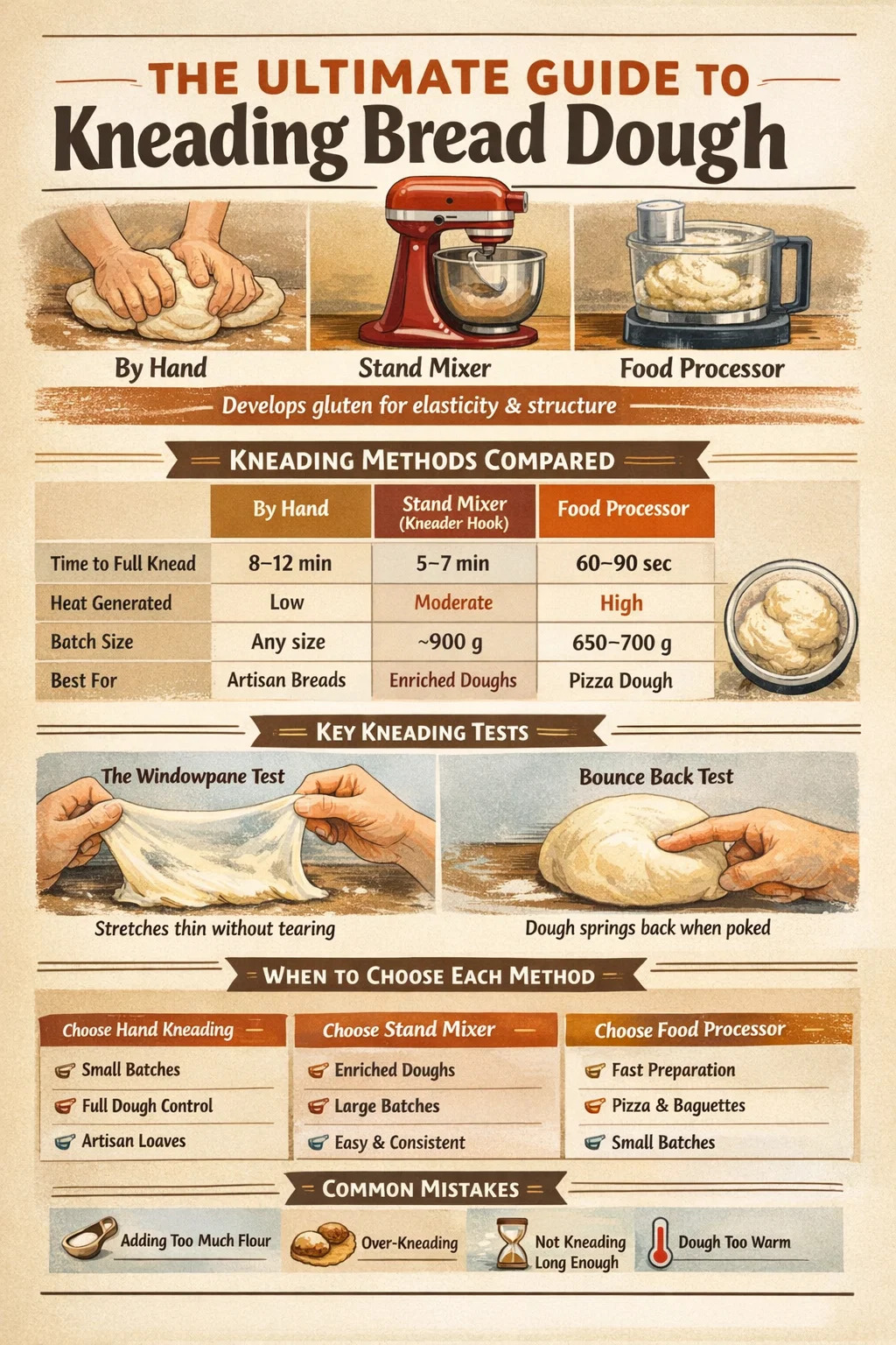 Cibé an bhfuil tú ag déanamh arán ceapaire, taos pizza, nó rollaí dinnéar bog, is é kneading an chéim a chinneann gach rud. Is féidir leat taos a knead go héifeachtach de láimh i 8-10 nóiméad, le meascthóir seastán i 5-7 nóiméad, nó le próiseálaí bia i díreach 60-90 soicind. Gníomhaíonn gach modh glútan go héagsúil agus oireann do bháicéirí éagsúla ag brath ar a n-uirlisí, méid an bhaisc, agus cé mhéad rannpháirtíocht fhisiceach a theastaíonn uathu sa phróiseas. Clúdaíonn an treoir seo na trí mhodh go mion — lena n-áirítear teicníc, uainiú, botúin choitianta, agus cathain go díreach a n-úsáidfear a gluine ceangaltán i gcoinne é a dhéanamh de láimh.