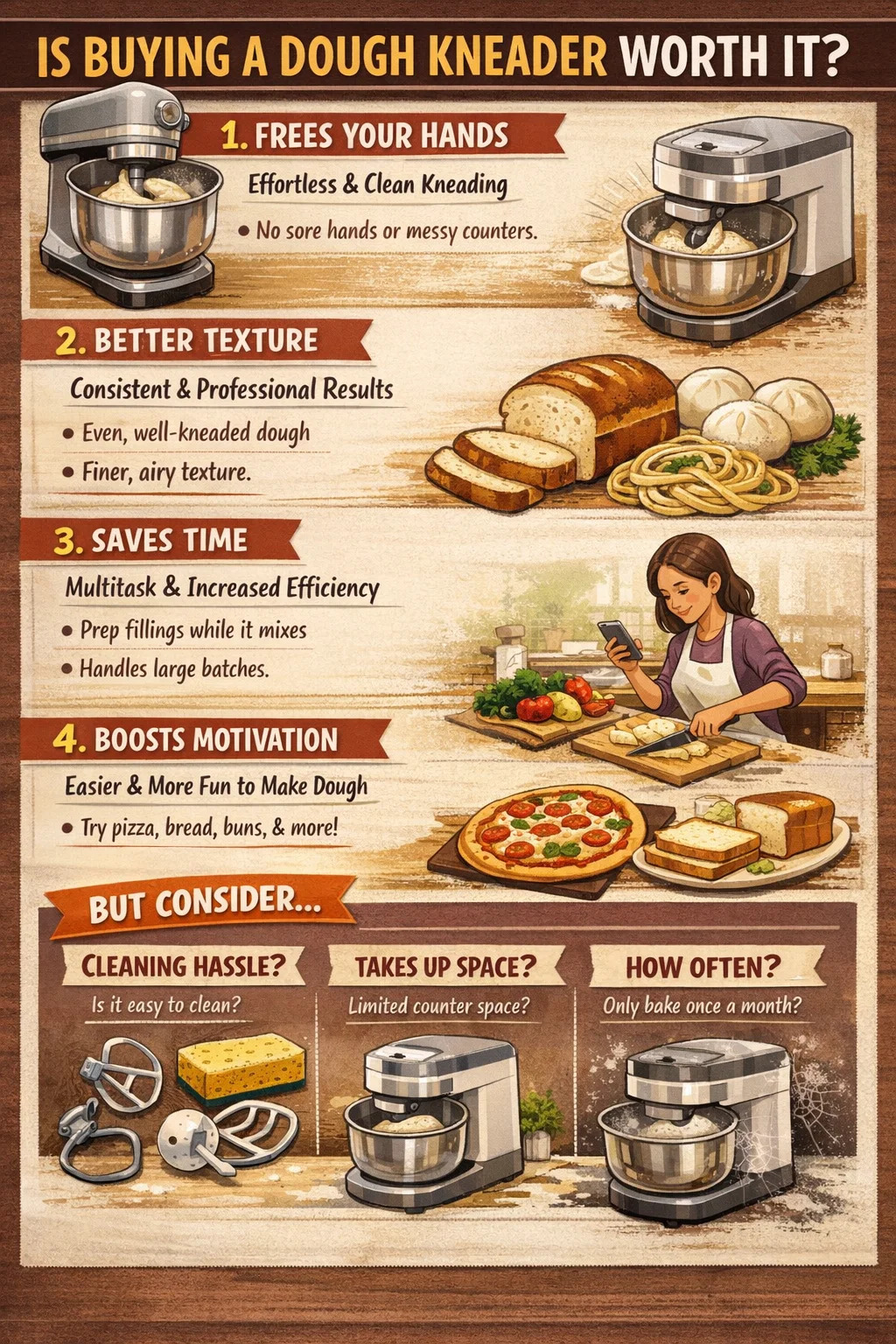 Gan stró: Tá éileamh fisiceach ar thaos kneading, go háirithe más mian leat an "pána fuinneoige" nó an uigeacht chewy sin a bhaint amach. Tá lámha tinn agus pian ar ais coitianta. Le meaisín, ní gá duit ach uisce agus plúr a dhoirteadh isteach agus brúigh an cnaipe.