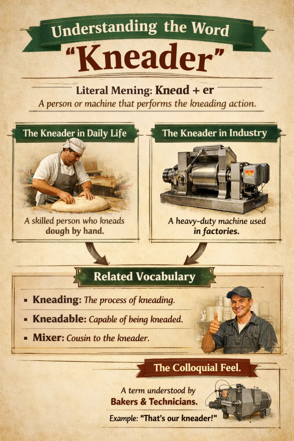 Tá an focal seo comhdhéanta den bhriathar "knead" (to knead taos) agus an iarmhír "-er" (iarmhír a léiríonn duine nó rud).