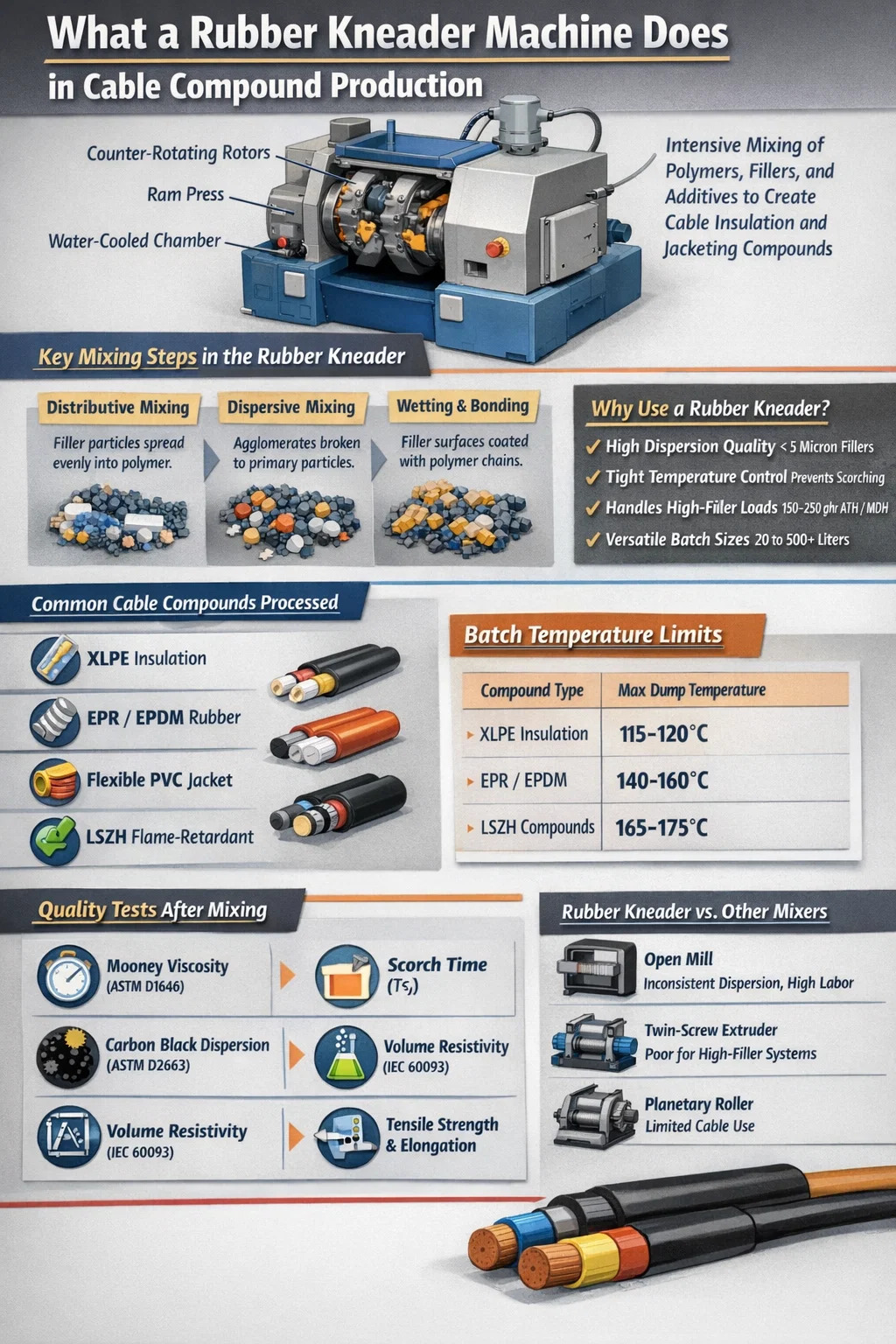 De ghnáth bíonn idir 15 agus 30 comhábhar aonair i gcomhdhúile inslithe cábla agus seaicéid. Má dhéantar gach comhábhar - go háirithe líontóirí carbóin dubh, shilice agus lasair-retardant - scaipthe go leibhéal na gcáithníní bunscoile faoi bhun 5 miocrón, cinneann sé go díreach cibé an n-éiríonn leis an gcábla críochnaithe tástáil neart tréleictreach, tástálacha aosaithe, agus caighdeáin iomadaithe lasair mar IEC 60332 nó UL 1666. Cruthaíonn geoiméadracht rotor an kneader rubair le geoiméadracht rotor an kneader rubair agus an tslabhra atá ag teastáil chun an tslabhra polaiméir a líonadh agus a fhliuchadh tasc meicniúil ager a bhriseadh. nach féidir cur chuige measctha níos simplí a bhaint amach go comhsheasmhach.